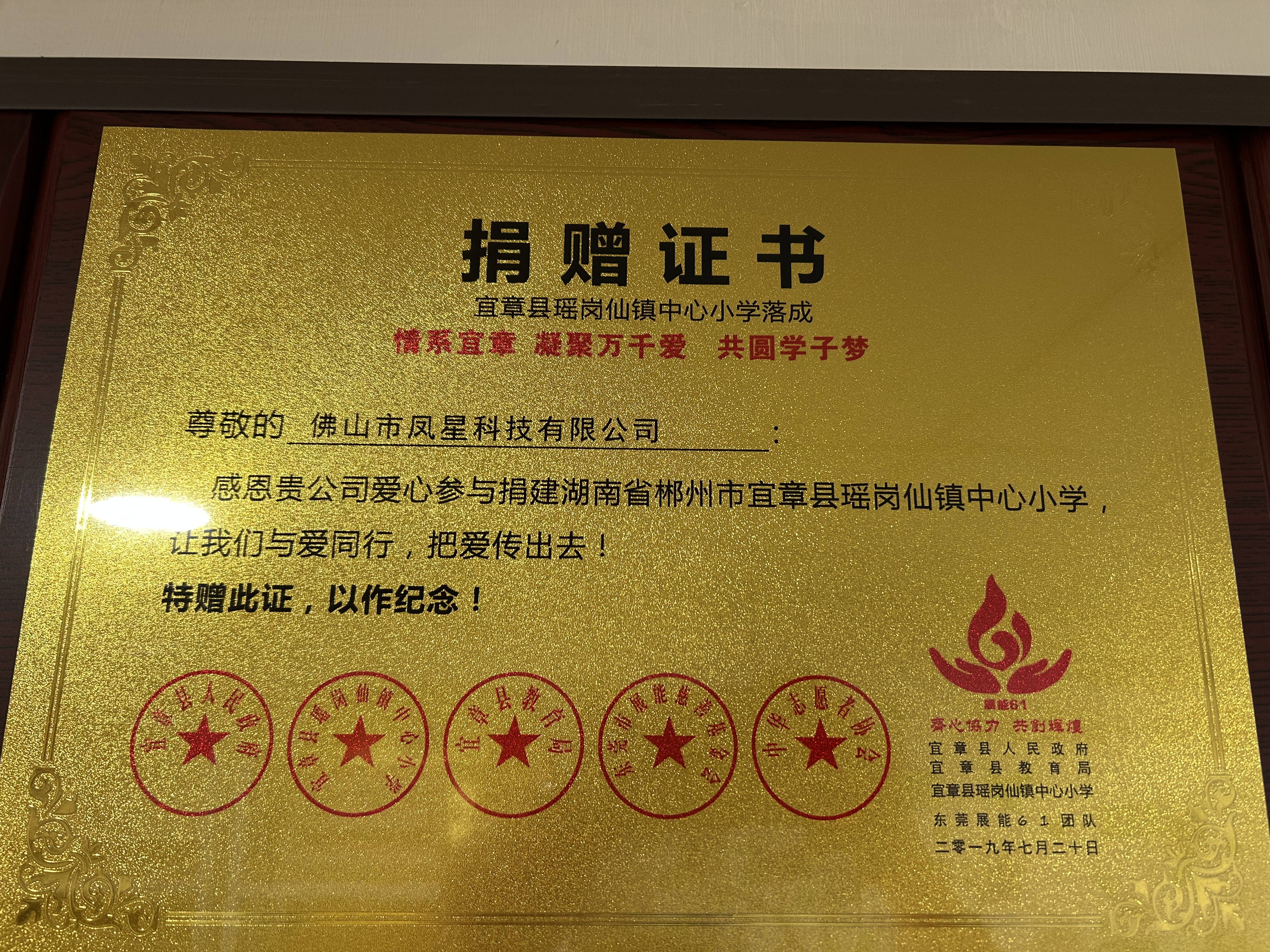 2• 2019年7月,凤星科技参与湖南省郴州市宜章县瑶岗仙镇中心小学捐建,以物资与资金支持学校基础设施完善,获多部门联合颁发的捐赠证书;